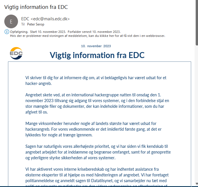 Havde jeg siddet med en af de virksomheder jeg repræsenterer iht. GDPR, jamen så havde jeg på igen måde accepteret løsningen. Men ikke desto mindre accepterede jeg den, da det omhandlede mine egne personoplysninger, hvilket jeg bittert kom til at fortryde, da jeg i november 2023 modtog e-mailen Vigtig information fra EDC, der blot beskæftigede mig i at jeg skulle have holdt fast i min første tanke om, at de nok ikke havde helt styr på opbevaring af mine personoplysninger.